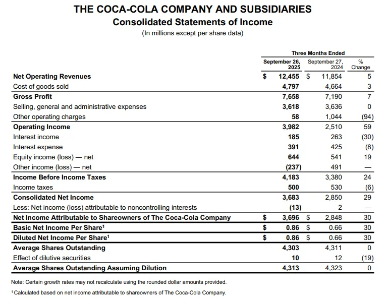 5、净利润同比增长29%!可口可乐发布2025年第三季度财报