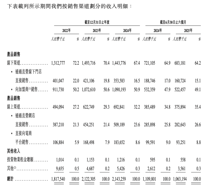 2022年、2023年、2024年和2025年上半年(下文简称“报告期内”),八马茶业加盟店数量分别为2579家、3054家、3255家、3341家,同期,来自加盟渠道的销售收入分别为9.12亿元、10.73亿元、10.90亿元及5.23亿元,分别占各期总收入的50.2%、50.6%、50.9%及49.1%。