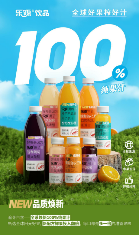 在完善功能水饮矩阵的同时,乐源也对经典线“乐源壹品”进行了全面的品质升级。值得关注的是,其果汁含量从50%提升至100%,实现了纯果汁标准的全线跨越。新配方不仅杜绝香精、色素及添加糖,更通过优化全球果源供应链,实现鲜果投入量的加倍。目前焕新系列已推出橙、芒果、葡萄、水蜜桃多个口味果汁,风味多元、满足不同喜好,让纯果汁成为日常健康饮品的优先选择。