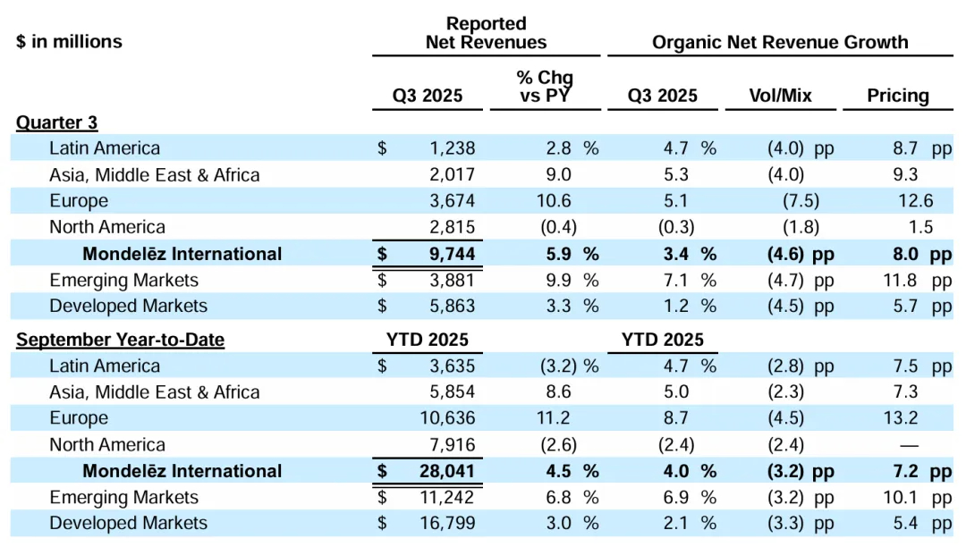 10月28日,亿滋发布2025年第三季度业绩。报告显示,公司第三季度净收入达97.44亿美元(折合人民币约693亿元),同比增长5.9%;有机净收入同比增长3.4%,超出市场预期;有机增长为3.4%,较第二季度的5.6%明显放缓;销量与产品组合下降4.6%,终端需求出现疲软。前三季度净收入280.41亿美元(折合人民币约1994亿元),同比增长4.5%;有机净收入同比增长4.0%。