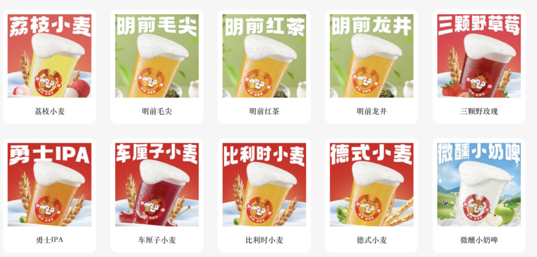 正因如此,福鹿家处处渗透着浓厚的“蜜雪基因”。从品牌定位看,福鹿家打出“成年人的奶茶,叫做微醺快乐”的口号,直接锚定与蜜雪重叠的年轻客群。天下网商发现,为贴合年轻客群,降低饮用门槛,它将酒精度控制在2.3—5度,开发果啤、奶啤等有清甜口感的品类。价格上也贯彻平价策略:5.9元的基础鲜啤、8.8元的茶啤、9.9元的果啤,即便最贵的区域限定款也仅14.9元,比多数同赛道品牌低出30%—40%。