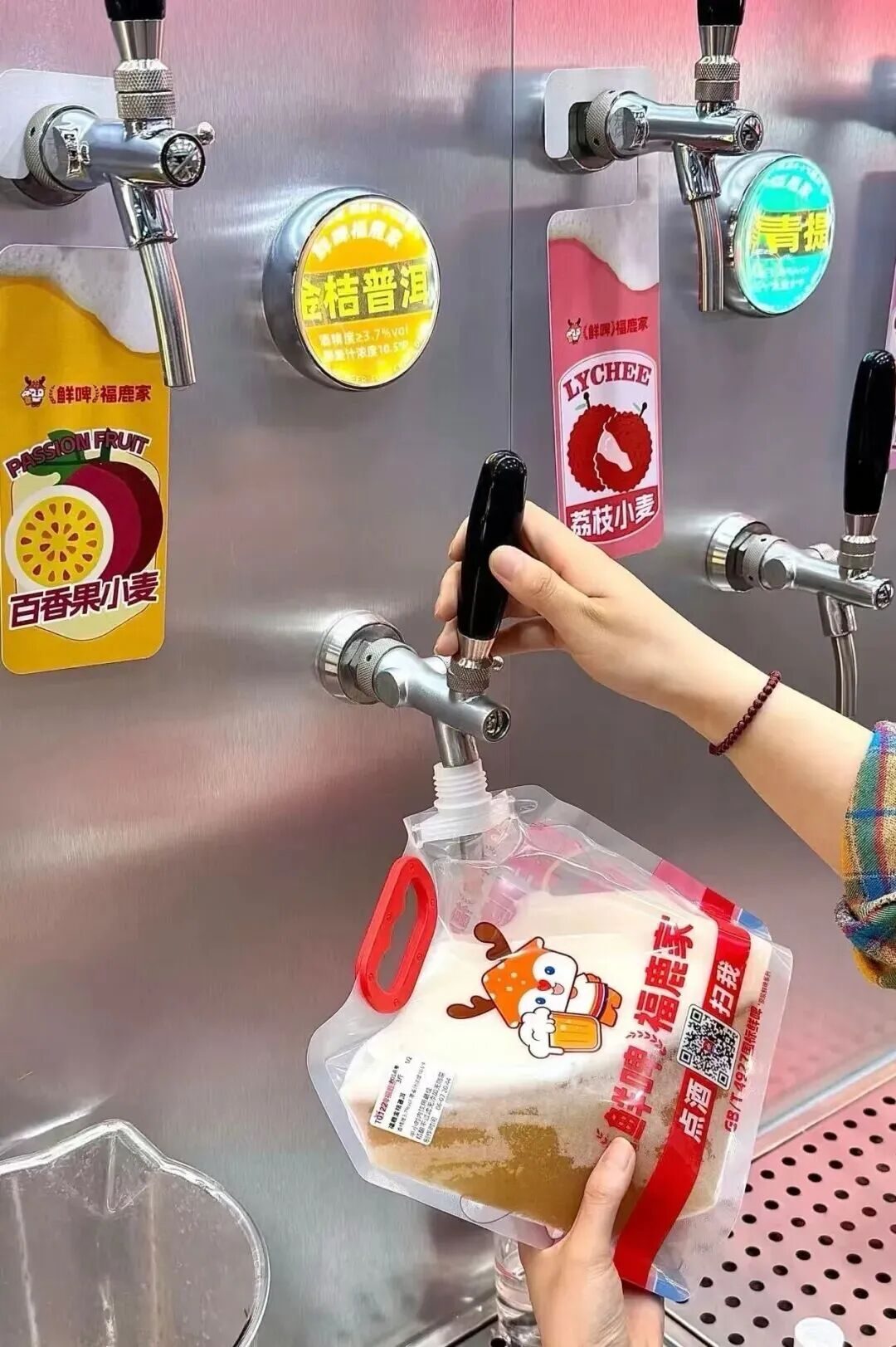 从运营模式看,它也复刻了奶茶店的轻量化,20多平米的小店、以外卖自提为主,连门店选址逻辑、装修风格都与蜜雪茶饮店高度趋同。为了突出现制,福鹿家也和奶茶店一样,把接酒开关放到消费者可以看到的位置,当面把啤酒接到杯子或是袋子里,强化新鲜认知。